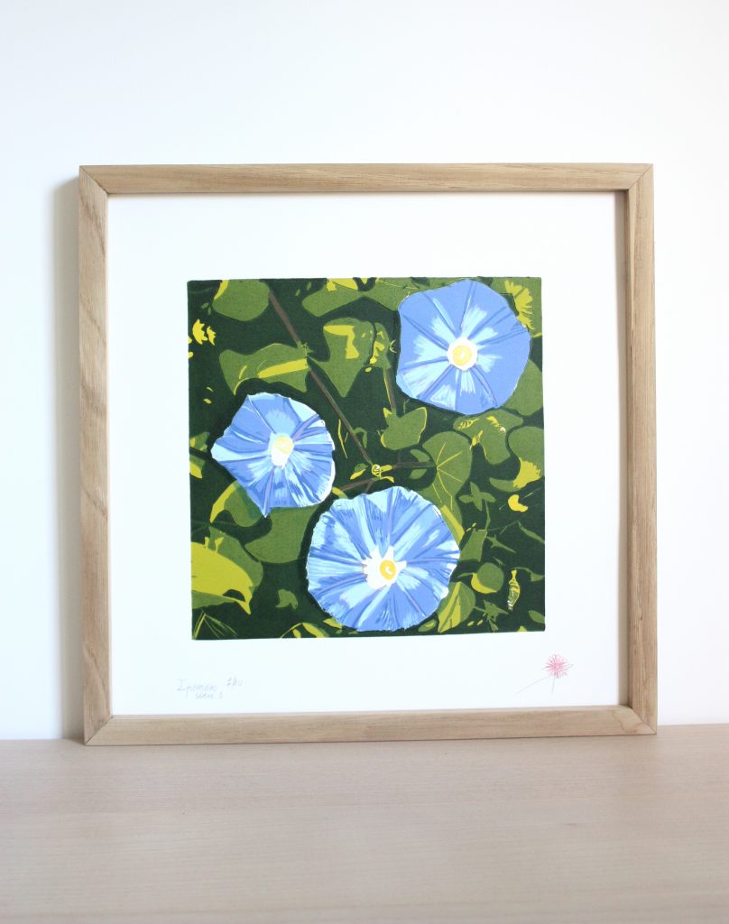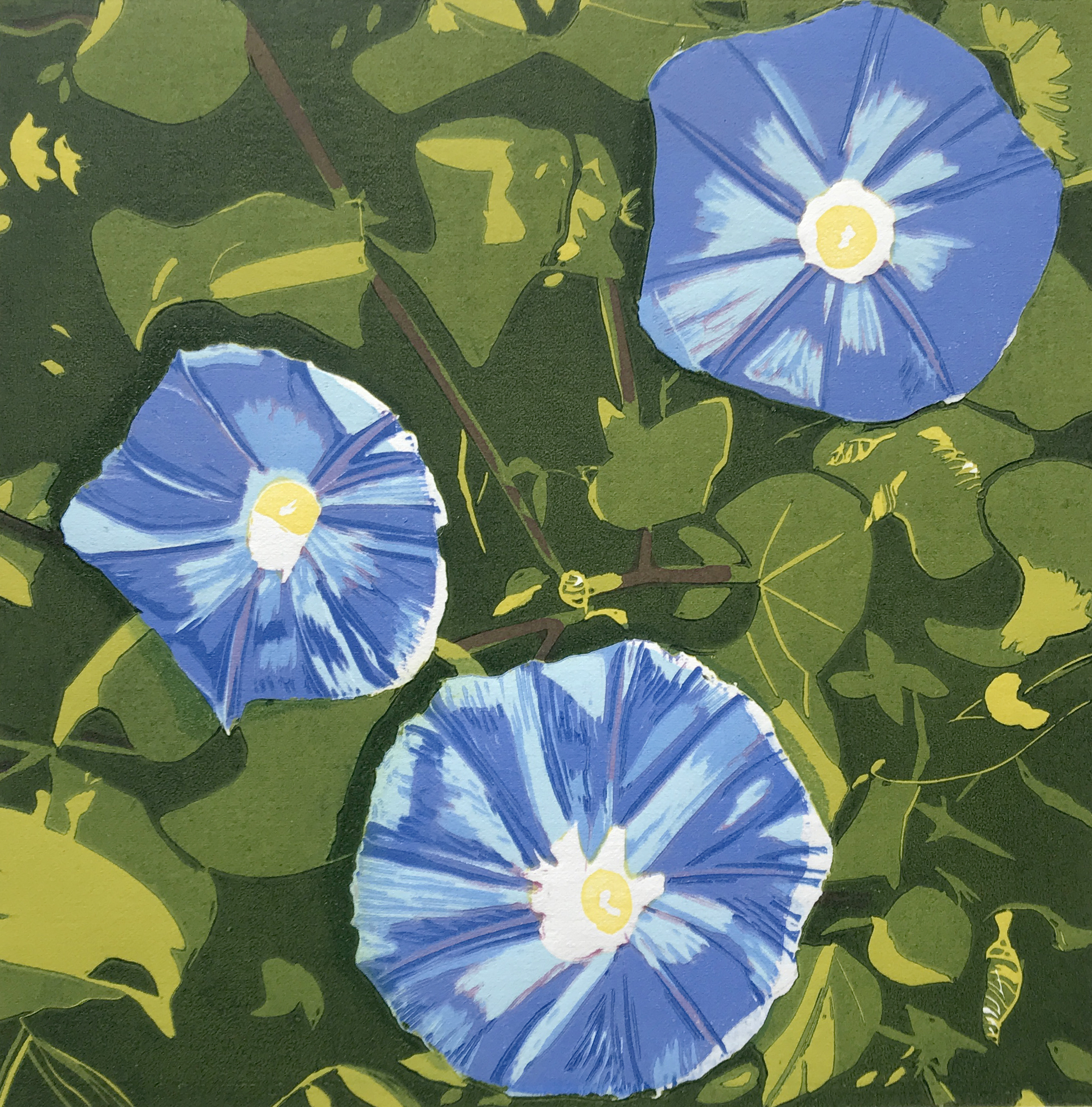 Ipomée Linogravure plaque perdue en 9 couleurs, Série 1 numérotées 7/10 Format 300 x 300 mm Août 2024